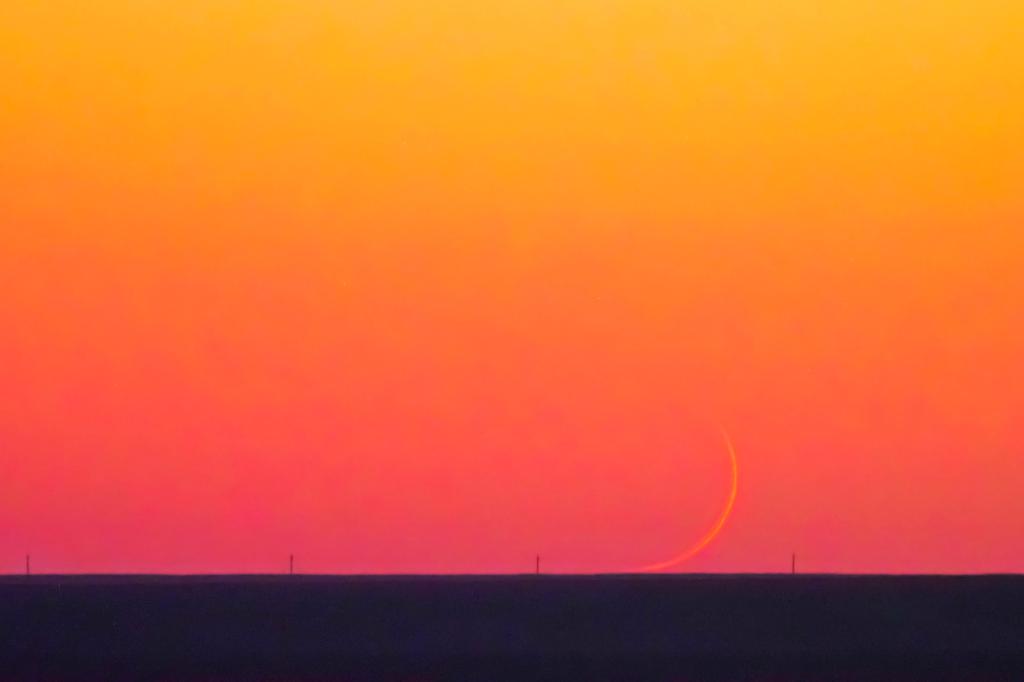所谓年度最小蛾眉月,在新疆哈密海滨拍摄的蛾眉月。宛如女子细长的眉毛,9月26日的蛾眉月是最小的。修立鹏说。形成的蛾眉月被称为最小蛾眉月,也称残月。
